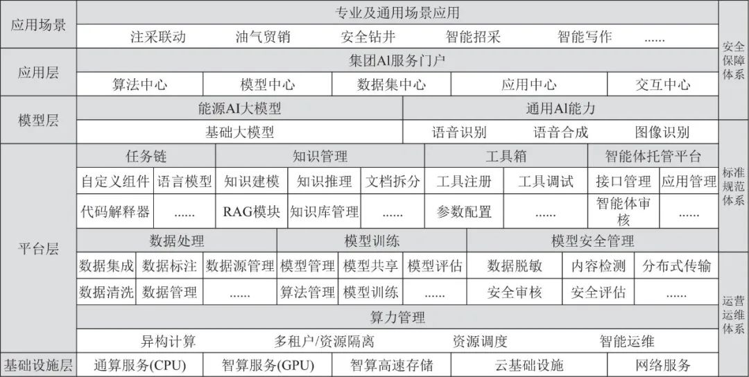 為適應技術發(fā)展趨勢,大型能源集團緊盯油氣行業(yè)智能化應用發(fā)展趨勢,積極規(guī)劃AI建設。采用軟硬件一體化模式開展AI大模型平臺建設項目,涵蓋算力、存儲、網絡與安全4方面資源。算力資源方面,通算云主機用于通用辦公業(yè)務,智算服務器承載AI大模型訓練;存儲資源方面,通算固態(tài)硬盤(Solid State Drive,SSD)塊存儲掛載國產云主機,智算提供充足獨立存儲空間,滿足特定帶寬與每秒輸入/輸出操作次數(shù)(Input/Output Operations Per Second,IOPS)需求;網絡資源方面,云上互聯(lián)網帶寬供應用訪問,高速專線實現(xiàn)智算資源池與內網互通,智算服務器計算節(jié)點及計算與存儲節(jié)點有高速互聯(lián);安全資源方面,滿足國家等級保護2.0三級標準,從多個維度提供多種安全保障。圍繞智能油氣田、智能工程、智能工廠、智能貿銷、智能供應鏈、智能管理、智能辦公等8大類100多個業(yè)務場景模型,聚力實現(xiàn)小模型和大模型兼?zhèn)?、專業(yè)場景和通用場景兼容、生產和經營管理全覆蓋,支持集團上中下游業(yè)務,如圖2所示。