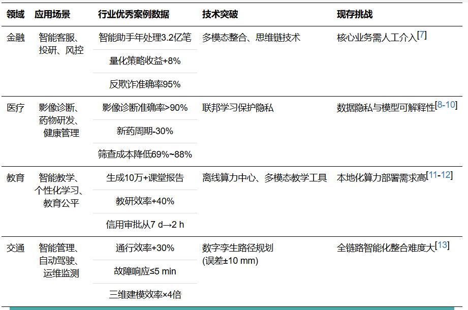 當前,AI大模型已在金融、醫(yī)療、教育、交通等領域實現(xiàn)深度滲透,展現(xiàn)出顯著的產業(yè)價值與技術潛力。如表1所示,在金融領域,智能客服與風控系統(tǒng)的高效運作體現(xiàn)了多模態(tài)整合與思維鏈技術的成熟應用,但核心決策仍依賴人工。醫(yī)療領域通過聯(lián)邦學習等技術突破,在影像診斷、藥物研發(fā)等方面取得成果,但數(shù)據(jù)隱私與模型可解釋性仍是關鍵瓶頸。教育領域依托離線算力中心與多模態(tài)工具,實現(xiàn)教學效率躍升,而本地化算力需求成為規(guī)?;瘧玫闹萍s因素。交通領域借助數(shù)字孿生技術顯著提升運維效率,但全鏈路智能化整合仍需突破。