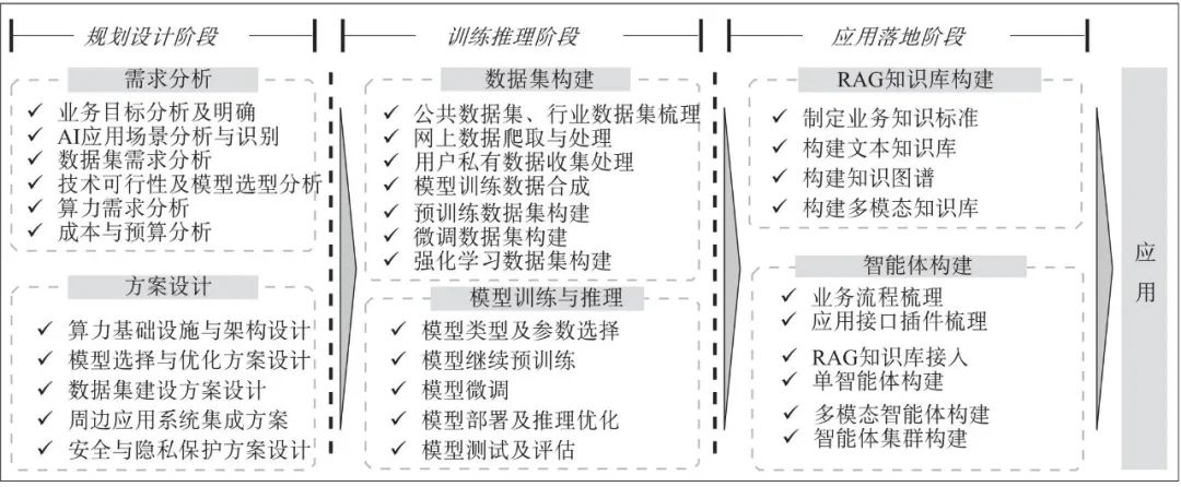 AI工程化整體流程涵蓋規(guī)劃設計、訓練推理和應用落地三個階段(如圖1所示)。在規(guī)劃設計階段,首要關注企業(yè)戰(zhàn)略和業(yè)務目標選擇,圍繞全鏈路規(guī)劃展開需求分析,包括業(yè)務目標分析、AI應用場景分析、數(shù)據(jù)需求分析、技術可行性及算力需求分析等。同時,基于AI原生(AI Native)的系統(tǒng)方案設計強調業(yè)務需求理解、數(shù)據(jù)治理、模型優(yōu)化與部署以及監(jiān)控與運維的重要性,遵循以AI為核心、數(shù)據(jù)優(yōu)先、持續(xù)學習與迭代、自適應與個性化等設計原則。在訓練推理階段,針對通用AI大模型存在的“有幻覺、成本高”等問題,行業(yè)、領域AI大模型成為落地“人工智能+”的有效手段,企業(yè)需根據(jù)自身情況選擇開發(fā)L1行業(yè)模型或L2場景模型,并依托成熟工具平臺支撐數(shù)據(jù)集工程交付能力,同時注重模型體系設計與選擇、訓練及調優(yōu)以及推理優(yōu)化及評估等關鍵環(huán)節(jié)。在應用落地階段,智能體應用為AI大模型應用落地提供技術化手段,通過構建檢索增強生成(Retrieval-Augmented Generation,RAG)知識庫解決私域數(shù)據(jù)利用及實時性問題,同時智能體構建的技術方法手段多樣,包括通過開發(fā)框架直接開發(fā)和基于智能體使能平臺構建應用,且智能體全生命周期可觀測體系和集群全生命周期管理體系為企業(yè)AI應用的穩(wěn)定運行和持續(xù)優(yōu)化提供保障。