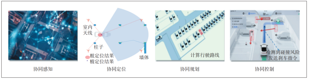 典型場(chǎng)景如智慧泊車,通過(guò)協(xié)同感知、協(xié)同定位、協(xié)同規(guī)劃和協(xié)同控制等技術(shù)實(shí)現(xiàn)高效、智能的停車管理和服務(wù)(見(jiàn)圖1)。智慧泊車的技術(shù)核心是根據(jù)多源傳感器異構(gòu)算法聯(lián)合感知的異步動(dòng)態(tài)協(xié)同感知系統(tǒng),基于場(chǎng)側(cè)的無(wú)線通信技術(shù)和車輛即時(shí)定位與地圖構(gòu)建技術(shù)的協(xié)同定位系統(tǒng),同時(shí)基于先驗(yàn)地圖和實(shí)時(shí)路況的全局路徑調(diào)度和車輛感知的局部軌跡規(guī)劃的協(xié)同系統(tǒng),以及場(chǎng)端原始感知數(shù)據(jù)及預(yù)測(cè)與車輛實(shí)時(shí)規(guī)劃軌跡的實(shí)時(shí)干涉控制系統(tǒng),實(shí)現(xiàn)車路云一體化的泊車服務(wù)。