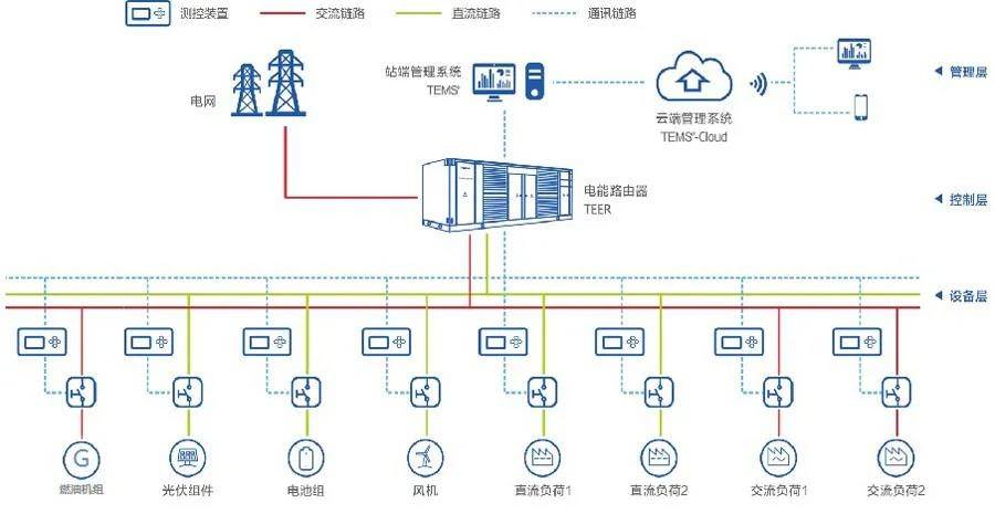 基于電力電子變壓器的交直流混合微網(wǎng)系統(tǒng)總體可分為三層架構(gòu)。第一層為設(shè)備層,主要囊括了分布式電源(風(fēng)電、光伏系統(tǒng)等)和不同的交直流負(fù)荷;第二層控制層,以電力電子變壓器為核心,分布式電源和負(fù)荷可通過其靈活的多端口配置實(shí)現(xiàn)可靠接入,并通過其中/高壓接口,實(shí)現(xiàn)與配電網(wǎng)的有效連接;第三層為管理層,以“雙端”能量管理系統(tǒng)為核心,采用人工智能算法可實(shí)現(xiàn)電力電子變壓器交直流混合系統(tǒng)的分布式能源互補(bǔ)優(yōu)化以及多個(gè)端口之間的協(xié)調(diào)控制,提高能源利用效率,多機(jī)并聯(lián)系統(tǒng)的集群控制、功率在線優(yōu)化分配,保障系統(tǒng)效率最優(yōu),同時(shí)能夠?qū)与娋W(wǎng)調(diào)度,參與電力市場交易及輔助服務(wù)等,真正實(shí)現(xiàn)綠色數(shù)據(jù)中心電能的智能路由。