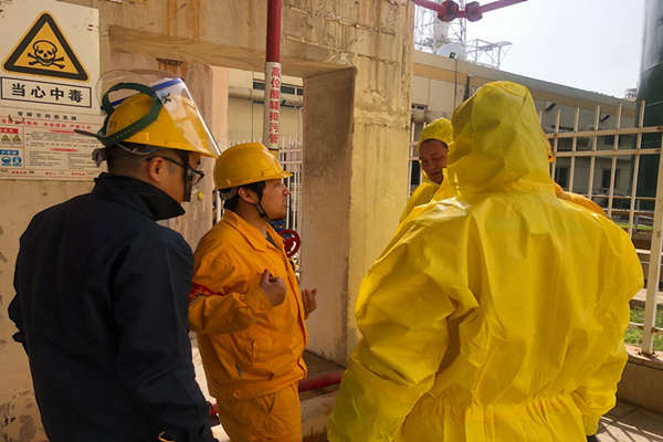 中國電力網(wǎng)訊 10月22日,南京化學(xué)工業(yè)園熱電有限公司(以下簡(jiǎn)稱公司)開展二期水處理鹽酸儲(chǔ)罐本體泄漏的應(yīng)急演練,本次演練采用實(shí)戰(zhàn)演練方式進(jìn)行,發(fā)電部一期集控丙值運(yùn)行人員參加本次演練,化學(xué)人員進(jìn)行監(jiān)護(hù)。