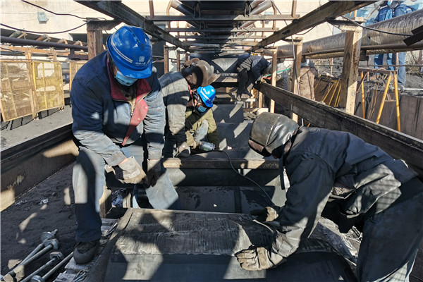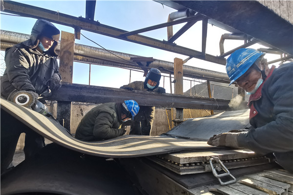 5日上午,工作人員做好粘接皮帶準(zhǔn)備工作,負(fù)責(zé)這次搶修工作的皮帶班,目前編制只有三名職工,承擔(dān)此次工作,顯然兩天內(nèi)完不成皮帶粘接任務(wù),燃運(yùn)分場(chǎng)打破常規(guī),合理分配人員,調(diào)派分場(chǎng)其他班組支援搶修,在剛剛完成三天搶修任務(wù)的情況下,克服困難繼續(xù)投入到搶修中。他們分工作業(yè)、分組負(fù)責(zé),一組用電火焊、導(dǎo)鏈、撬棍等工具修復(fù)皮帶滾筒,一組對(duì)斷裂皮帶進(jìn)行切割、打磨、對(duì)口、清洗、粘接和硫化等處理,同樣是在室外寒冷天氣搶修,汗水浸濕了他們的衣領(lǐng)和帽子,加上空間狹小,他們克服了重重困難,團(tuán)結(jié)作戰(zhàn),中午來(lái)不及休息,午飯后又繼續(xù)搶修工作,沒(méi)有一個(gè)人叫苦叫累,以頑強(qiáng)的毅力完成了當(dāng)天的皮帶粘接任務(wù)。