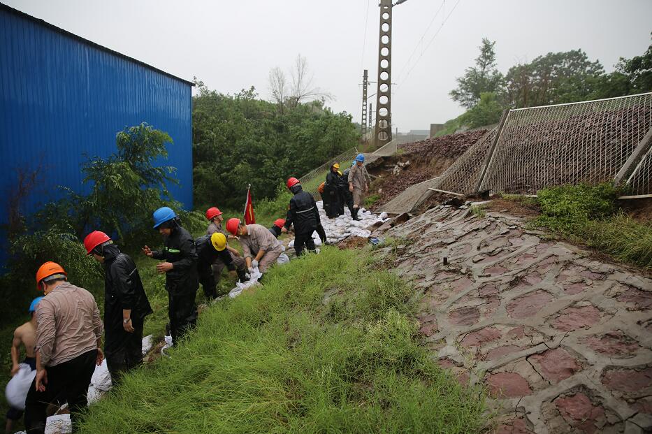 “鐵路專用線路場(chǎng)外區(qū)域索河鐵路大橋北段西側(cè)600米處護(hù)坡出現(xiàn)部分坍塌,我已撤到安全區(qū)域!”20日11時(shí)20分,巡線人員向指揮部報(bào)告。如果鐵路出了問(wèn)題將無(wú)法運(yùn)煤,沒(méi)有煤機(jī)組只能停運(yùn),指揮部的人員聽(tīng)到這個(gè)消息都出了一身冷汗。2臺(tái)轉(zhuǎn)載機(jī)1臺(tái)運(yùn)輸卡車立即到位,80余名黨員突擊隊(duì)員冒著大雨迅速來(lái)到塌方處,用石子、沙土等加固鐵路護(hù)坡,防止險(xiǎn)情繼續(xù)擴(kuò)大。