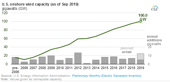 根據(jù)美國能源信息管理局(EIA)數(shù)據(jù),截至2019年9月,美國的陸上風(fēng)電累計裝機容量已超過100 GW,到2020年底可能達到122 GW。