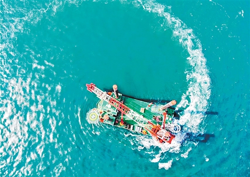 12月16日,由中國鐵建港航局集團有限公司投資打造的國內首艘1300噸自升自航式風電安裝船“鐵建風電01”在江蘇啟東交付使用。圖為“鐵建風電01”大回轉試驗。陳耀金攝(中經(jīng)視覺)