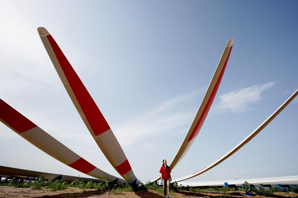 6月30日,河北省威縣一家風(fēng)電機組葉片制造企業(yè)工人對大型風(fēng)電機組葉片進行外觀檢測。新華社記者 駱學(xué)峰 攝