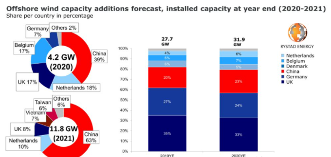 根據(jù)知名能源咨詢公司Rystad Energy數(shù)據(jù)統(tǒng)計,盡管受新冠疫情影響,2020年全球海上風電新增裝機4.2GW,同比增長15%,總裝機達到31.9GW。同時,該機構預測今年全球將新增裝機11.8GW,同比增長37%,最終裝機達到43.7GW。