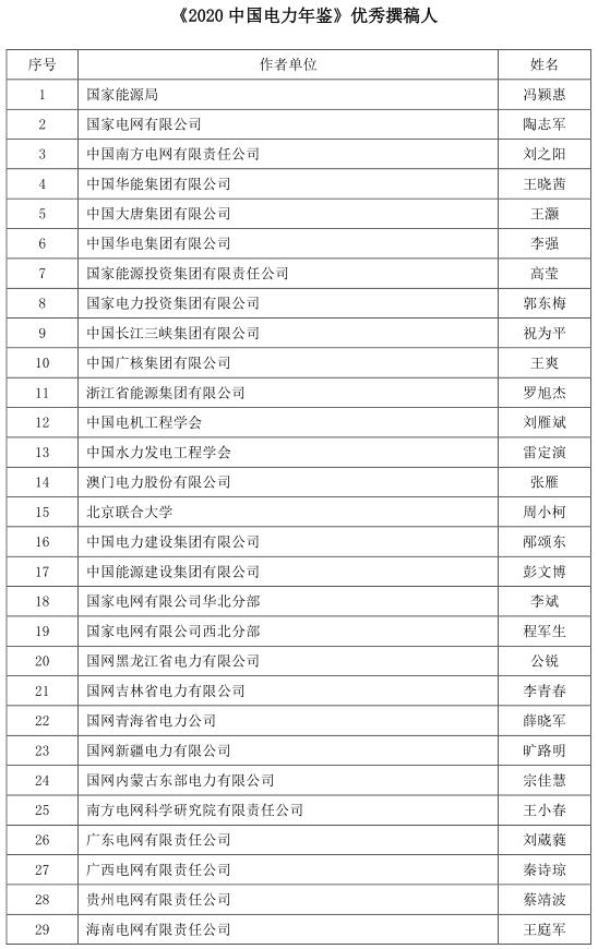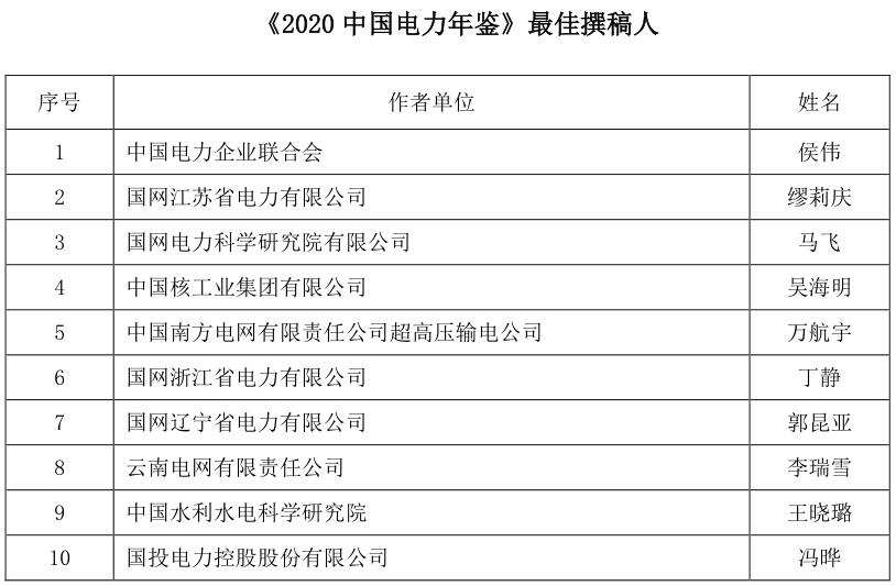 為促進《年鑒》編撰質(zhì)量的進一步提升,表彰在年鑒編撰工作中表現(xiàn)突出的先進個人,根據(jù)《<中國電力年鑒>優(yōu)秀撰稿人評獎辦法(試行)》,經(jīng)年鑒編輯部初評、評選委員會審核,評選出《2020中國電力年鑒》最佳撰稿人和優(yōu)秀撰稿人,現(xiàn)將名單予以公示。