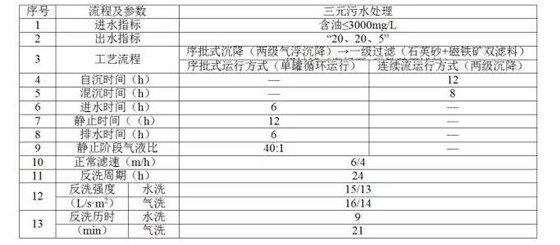 三采污水站分為普通聚驅(qū)污水站、高濃度聚驅(qū)污水站、三元污水站等,普通聚驅(qū)污水處理工藝流程與普通污水處理工藝流程相同,只是在過濾介質(zhì)、技術(shù)界限及工藝參數(shù)上做出調(diào)整。過濾介質(zhì)選擇適合含聚污水處理使用的石英砂、磁鐵礦等。當含聚污水中聚合物濃度高于450mg/L時,采用高濃度聚驅(qū)污水處理工藝,主要區(qū)別在于增加了沉降時間,過濾罐由石英砂改為石英砂磁鐵礦雙濾料過濾工藝。當處理含表活劑、聚合物、堿的三元污水時采用“連續(xù)流氣浮、序批曝氣沉降、石英砂磁鐵礦、海綠石磁鐵礦過濾”處理工藝三元污水處理工藝。