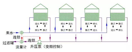 一次沉降罐、二次沉降罐、升壓緩沖罐、一次過濾罐、二次過濾罐、凈化水罐。主工藝流程介紹:該工藝中沉降段共有沉降罐4座,既可以實現(xiàn)兩級連續(xù)流沉降處理,又可以實現(xiàn)一級序批式沉降處理,每座沉降罐都配有曝氣系統(tǒng)。在原水含劑濃度低時,運行兩級連續(xù)流沉降;當原水含劑濃度升高,兩級連續(xù)流沉降處理不能保證出水合格時,運行一級序批式沉降。