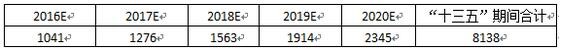 在2006至2011年的規(guī)?;こ虘?yīng)用階段,行業(yè)產(chǎn)值復(fù)合年均增速為21%,在2011年至2015年的全面推廣階段這一數(shù)值達(dá)到30%。目前雖然我國城鎮(zhèn)污水處理率已達(dá)90%,污水處理產(chǎn)能增長空間有限,但考慮到存量處理能力改造,再生水回用和工業(yè)廢水處理的潛在市場空間,以及排放指標(biāo)進(jìn)一步收嚴(yán),民眾對于選擇先進(jìn)環(huán)保技術(shù)的心理傾向等因素,“十三五”期間膜法水處理行業(yè)產(chǎn)值年均增速大概率落在20%-25%。取中位數(shù)22.5%進(jìn)行計(jì)算,到2020年行業(yè)產(chǎn)值達(dá)到約2345億,整個(gè)“十三五”膜法水處理產(chǎn)值可達(dá)8138億元。