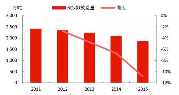 NOx的排放量為1852萬噸,“十二五”剛開始治理,當前的下降速度還處于上升趨勢,收關年2015年下降速度高達10.89%。