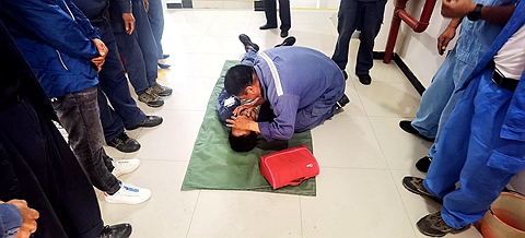 演練模擬大寺鄉(xiāng)發(fā)生6.5級破壞性地震,供電所辦公樓開始搖晃,指揮長嚴世莊大聲呼喊吹哨,各樓層內(nèi)所有人員立即采取正確的避震措施,迅速抱頭尋找最近的墻角、柱角、堅固高大的桌下、柜旁或開間小的衛(wèi)生間、內(nèi)承重墻墻角蹲下、抱頭、閉眼,抓牢或握實以盡量固定身體,使用安全帽等保護頭部,降低身體重心。隨著指揮長第二次呼喊緊急撤離,各樓層緊急組織人員安全迅速從安全指定安全通道疏散到指定聚集點,過程中員工互相呼喚、提醒避震。撤離后清點發(fā)現(xiàn)1人失蹤,急救組立刻對失蹤人員進行搜救,搜救人員在二樓辦公室發(fā)現(xiàn)失蹤人躺在地上,左手臂被傾倒的辦公桌壓住,造成骨折,同時發(fā)現(xiàn)兩根0.22KV電線(鋁塑線)達在傷員身上,并正通有電源,傷員無意識,心跳呼吸停止同時發(fā)生人員觸電,搜救人員立即斷開有關(guān)電源,用木棒挑開電線,迅速轉(zhuǎn)移傷員至安全地帶后對其進行心肺復蘇和外傷急救,并撥打120急救電話。經(jīng)全力搶救,傷員已恢復自主心跳和呼吸,搶救人員對其進行外傷包扎后就地觀察,等待120急救人員到來,同時有人員報告一樓安全工器具室發(fā)生火災,指揮組迅速組織人員對著火點進行滅火器滅火。