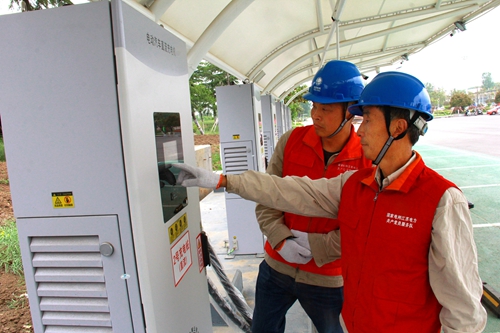 中國電力網(wǎng)訊 5月13日,江蘇連云港市東??h供電公司駝峰供電所服務(wù)人員趙孫華、何文軍在縣開發(fā)區(qū)花卉市場門前檢查電動汽車充電樁運(yùn)行情況。