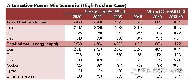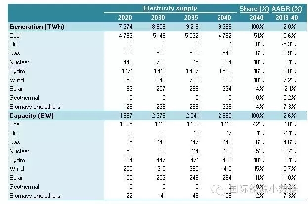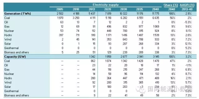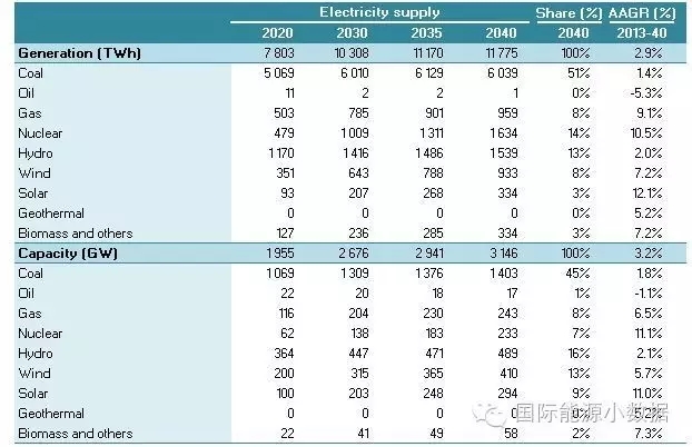 2040 年一次能源供應(yīng)達(dá)到46.95億噸標(biāo)油,其中煤炭占51%、石油16%、天然氣13%、核電5%、水電3%、非水可再生能源12%。從發(fā)電量來看,2040年總裝機(jī)達(dá)3145吉瓦,發(fā)電量達(dá)11.78萬億千瓦時,煤電占56%、天然氣發(fā)電9%、核電8%、水電13%、風(fēng)電8%、光伏3%、生物質(zhì) 3%。