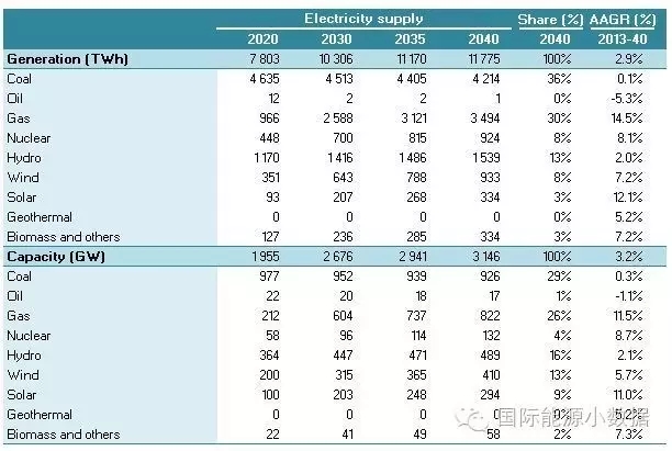 在大力推廣天然氣發(fā)電的情境下,2040年一次能源供應(yīng)為46.13億噸標(biāo)油,其中煤炭跌至40%、石油16%、天然氣高達(dá)23%、核電5%、水電3%、非水可再生能源13%。從發(fā)電量來看,2040年總裝機(jī)達(dá)3146吉瓦,發(fā)電量達(dá)11.78萬億千瓦時,煤電占36%、天然氣發(fā)電30%、核電8%、水電 13%、風(fēng)電8%、光伏3%、生物質(zhì)3%。