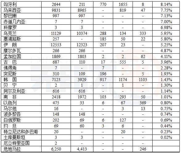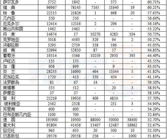 表2列出了154個(gè)國(guó)家的再生能源發(fā)電量,并有占發(fā)電總量的百分率;而且有再生能源發(fā)電總量的構(gòu)成。數(shù)據(jù)取自2012~2015年各國(guó)的數(shù)據(jù),當(dāng)然數(shù)據(jù)會(huì)不斷更新,但只會(huì)更好。由于地?zé)岚l(fā)電量小,未列入表中。