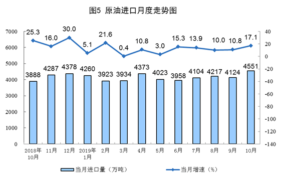 10月份,原油進(jìn)口4551萬噸,同比增長(zhǎng)17.1%,增速比上月加快6.3個(gè)百分點(diǎn)。1—10月份,原油進(jìn)口41454.5萬噸,同比增長(zhǎng)10.5%。