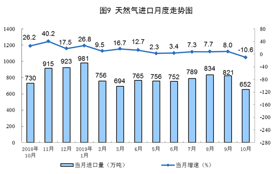 10月份,天然氣進(jìn)口652萬噸,同比下降10.6%,增速由正轉(zhuǎn)負(fù),上月為增長(zhǎng)8.0%。1—10月份,天然氣進(jìn)口7771萬噸,同比增長(zhǎng)7.9%。
