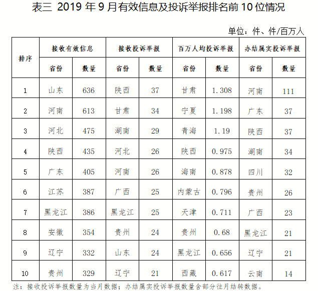 各省(自治區(qū)、直轄市)按照收到的有效信息數(shù)量排序,山東、河南、河北、陜西、廣東等排在全國前10位;按照投訴舉報數(shù)量排序,陜西、甘肅、湖南、河北、河南等排在全國前10位。按照百萬人均投訴舉報數(shù)量排序,甘肅,寧夏,青海,陜西,海南等排在全國前10位。按照辦結(jié)屬實投訴舉報數(shù)量排序,河南、廣東、陜西、湖南、四川等排在全國前10位。(2019年9月有效信息及投訴舉報排名前10位情況見表三)