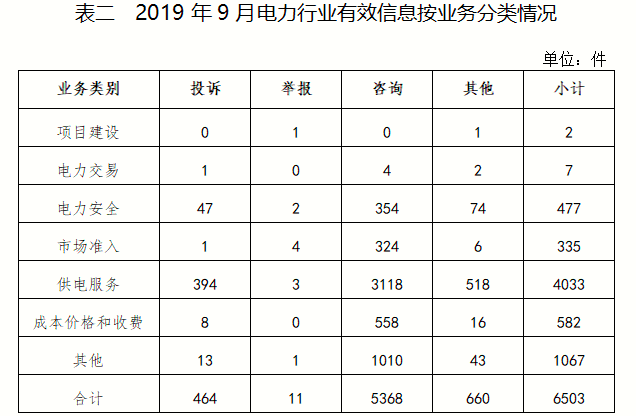 電力行業(yè)排在首位,有效信息數(shù)量為6503件,占全部有效信息的77.62%;其中受理的投訴舉報數(shù)量為475件,占全部投訴舉報數(shù)量的94.81%。群眾反映的問題主要集中在供電服務(wù)、電力安全、成本價格和收費(fèi)等方面。(2019年9月電力行業(yè)有效信息按業(yè)務(wù)分類情況見表二)
