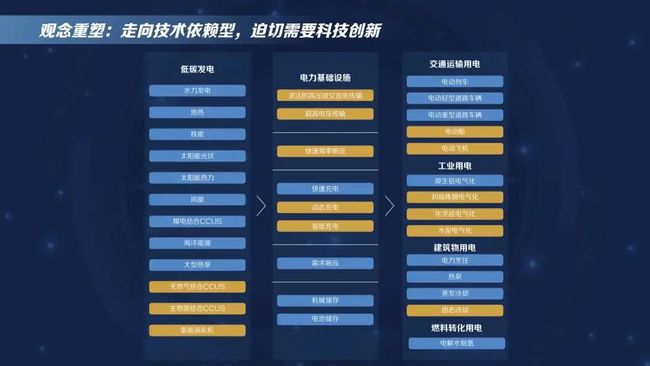關(guān)于能源結(jié)構(gòu)降碳,它的核心是要大幅度地提升可再生能源或者非化石能源的比例。非化石能源最典型的有四個,分別是風(fēng)能、太陽能、水能、核能。其中風(fēng)能、太陽能將來占的比例會更高。全球風(fēng)、光資源分布相對更均勻,誰能夠更好地掌握抓取風(fēng)、光資源,即開發(fā)出大規(guī)模應(yīng)用風(fēng)電、光伏電的領(lǐng)先技術(shù)體系,誰就獲得了長期經(jīng)濟(jì)發(fā)展支撐能力的提升。這是一個資源依賴型走向技術(shù)依賴型的過程,未來這個過程會使我們更多地關(guān)注關(guān)鍵技術(shù)。