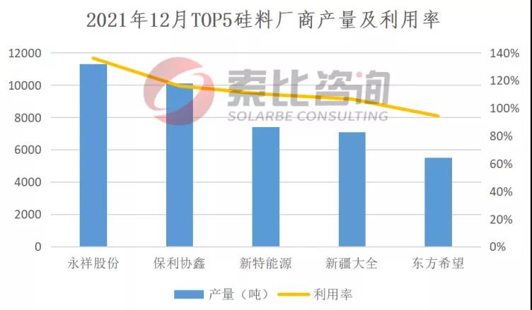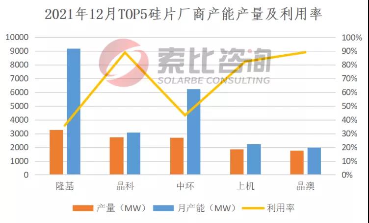 根據(jù)索比咨詢統(tǒng)計,2021年12月,前五大硅料企業(yè)總產(chǎn)量4.14萬噸,綜合產(chǎn)能利用率112.6%。硅片方面,兩家頭部企業(yè)開工率回至50%以上,一體化企業(yè)開工率相對較高。去年12月,國內(nèi)硅片產(chǎn)量17.85GW,環(huán)比下降8.6%。按照產(chǎn)量排名,隆基、晶科、中環(huán)、上機、晶澳位列前五,總產(chǎn)量12.35GW,占比69.19%,綜合利用率67.81%。雖然有觀點認為,中環(huán)的實際產(chǎn)能利用率要高于上述數(shù)據(jù),但總體看,產(chǎn)業(yè)鏈上游價格居高不下,已經(jīng)影響到終端需求,并反作用于上游。