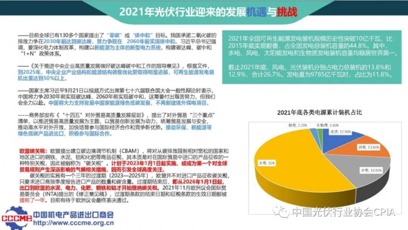 中國機電產(chǎn)品進出口商會光伏分會秘書長張森介紹光伏產(chǎn)品國際貿(mào)易情況。2021年我國光伏產(chǎn)業(yè)規(guī)模、對外貿(mào)易量持續(xù)擴大,行業(yè)發(fā)展主要痛點是光伏貿(mào)易摩擦再次升級、海運費和匯率大幅上漲等。