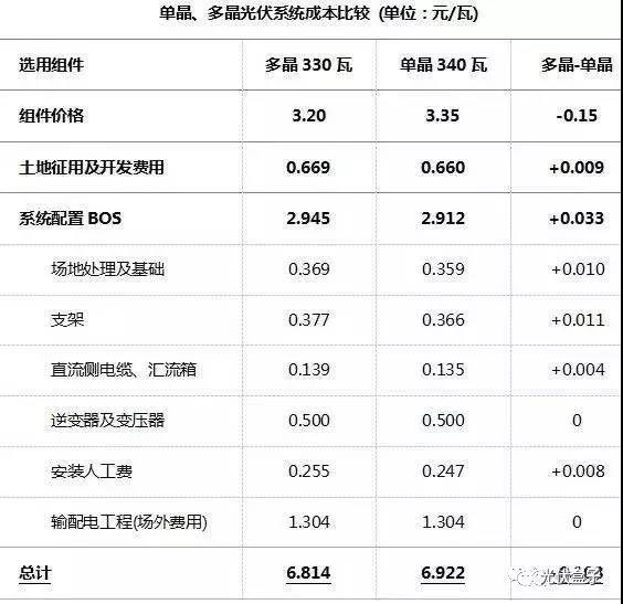 上表我們假設(shè)電站系統(tǒng)選用多晶330瓦或單晶340瓦組件所對應的系統(tǒng)成本對比,包含組件、逆變器、匯流箱、支架、線纜、土地、人工等成本。