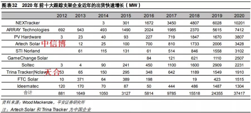 在2012-2020年度全球10大跟蹤企業(yè)出貨量排名中,中信博和天合光能是國(guó)內(nèi)僅有的2家進(jìn)入全球出貨前10的跟蹤支架企業(yè)。