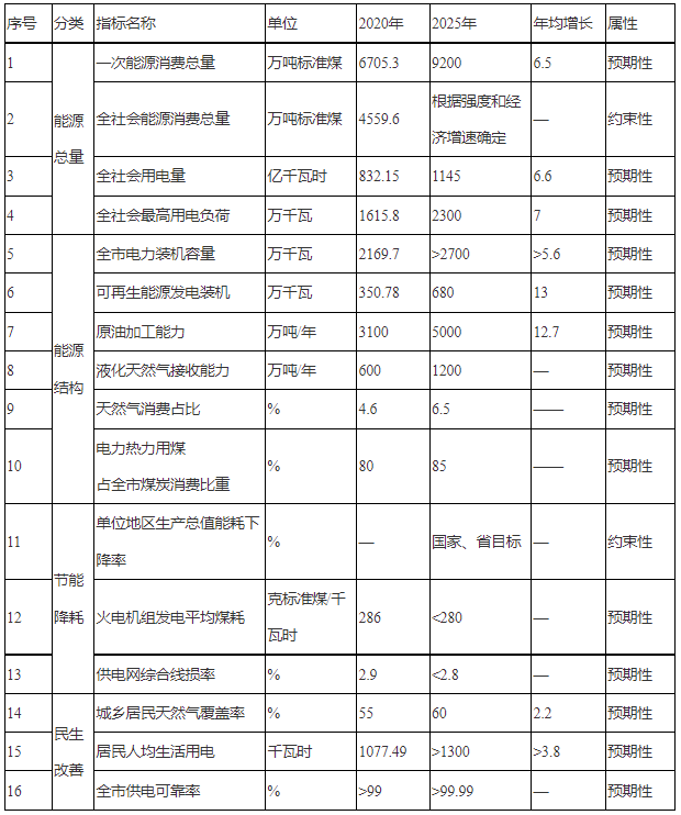 2.結(jié)構目標。到2025年,全市電力裝機容量達到2700萬千瓦以上,其中,可再生能源發(fā)電裝機容量達到680萬千瓦以上,清潔能源發(fā)電裝機占電力總裝機容量達到45%以上;原油加工能力達到5000萬噸/年,液化天然氣接收能力達到1200萬噸/年;全市能源消費結(jié)構進一步優(yōu)化,天然氣消費占比力爭達到6.5%;電力熱力用煤占全市煤炭消費比重達到85%以上。
