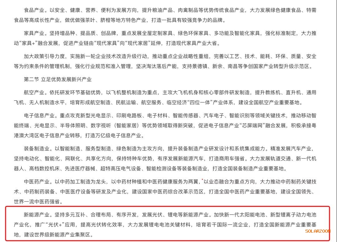 除發(fā)電端外,江西省在“十四五”期間,將加快新一代太陽能電池、新型鋰離子動(dòng)力電池產(chǎn)業(yè)化,推廣“光伏+”應(yīng)用,提高光伏轉(zhuǎn)化效率,大力發(fā)展鋰電電池關(guān)鍵材料,培育若干國際一流企業(yè),打造全國新能源產(chǎn)業(yè)重要基地,建設(shè)世界級新能源產(chǎn)業(yè)集聚區(qū)。