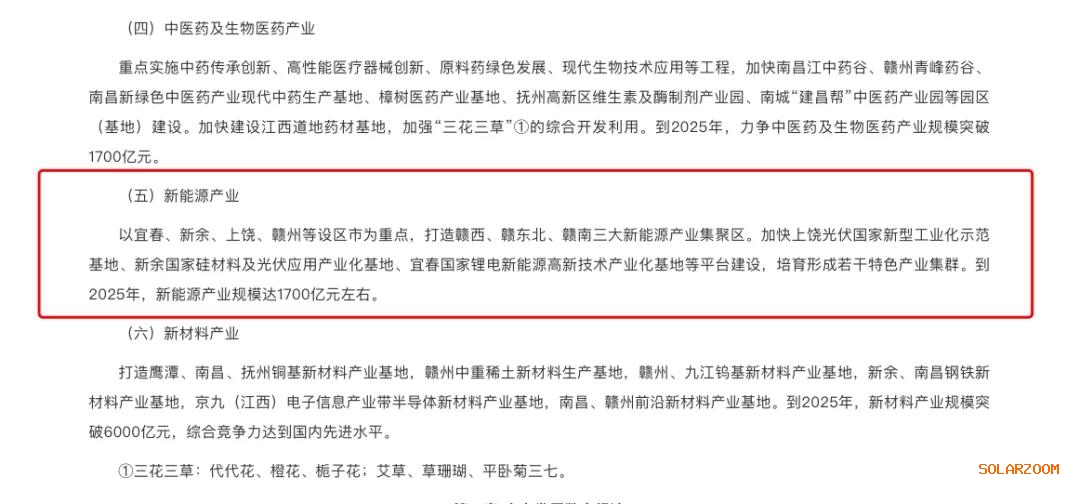 以宜春、新余、上饒、贛州等設(shè)區(qū)市為重點(diǎn),打造贛西、贛東北、贛南三大新能源產(chǎn)業(yè)集聚區(qū)。加快上饒光伏國家新型工業(yè)化示范基地、新余國家硅材料及光伏應(yīng)用產(chǎn)業(yè)化基地、宜春國家鋰電新能源高新技術(shù)產(chǎn)業(yè)化基地等平臺(tái)建設(shè),培育形成若干特色產(chǎn)業(yè)集群。到2025年,新能源產(chǎn)業(yè)規(guī)模達(dá)1700億元左右。