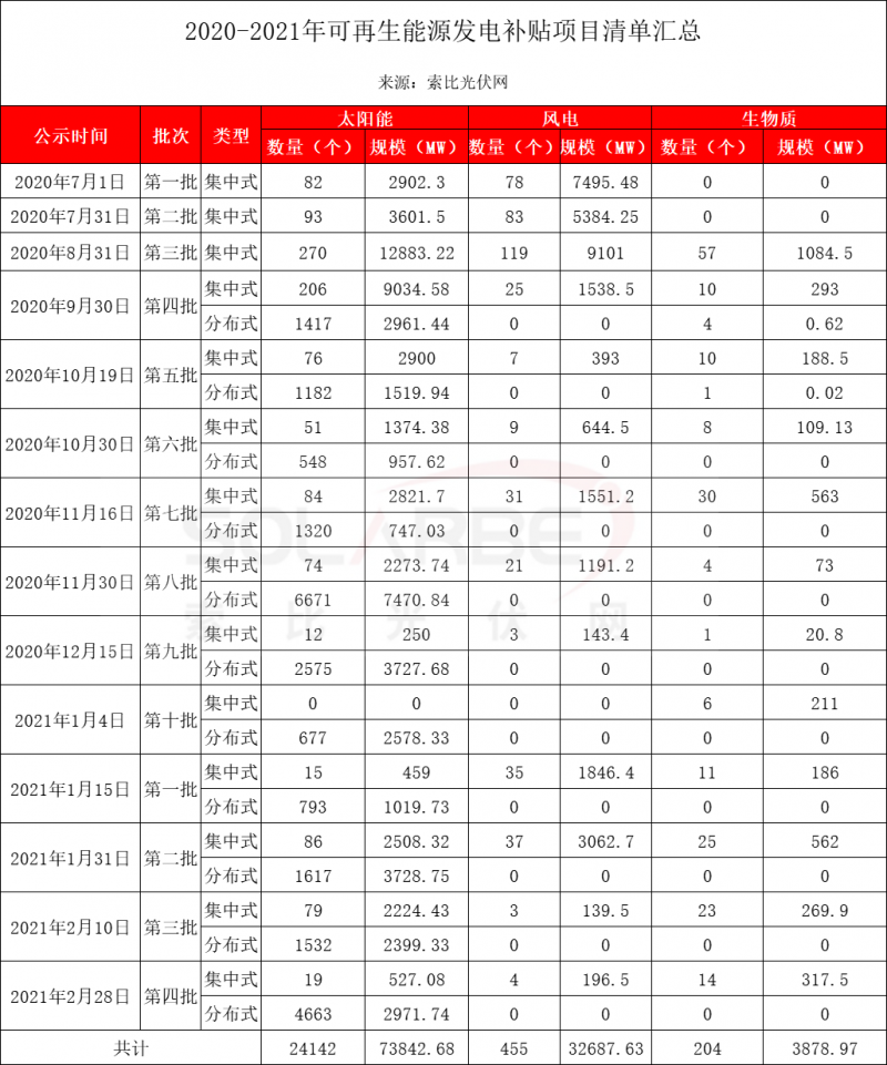 據(jù)索比光伏網(wǎng)統(tǒng)計,2020年至今,國家電網(wǎng)共公布十四批可再生能源補貼清單。其中,太陽能發(fā)電項目24142個,容量73.84GW;風(fēng)電項目455個,容量32.69GW;生物質(zhì)發(fā)電項目204個,容量3.88GW。