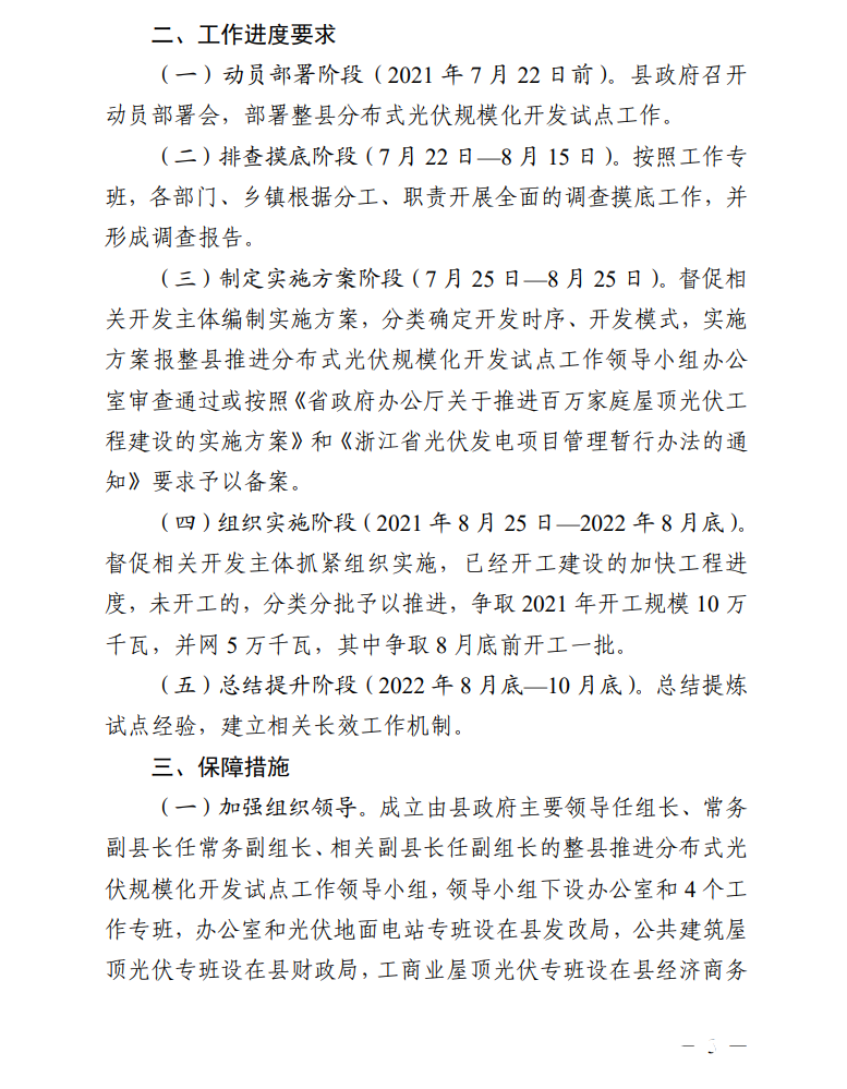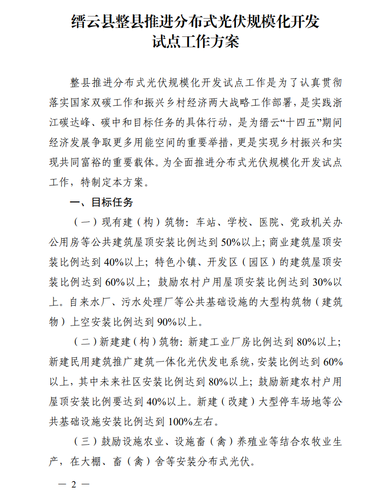 日前,縉云縣人民政府辦公室發(fā)布關(guān)于印發(fā)《縉云縣整縣推進(jìn)分布式光伏規(guī)模化開(kāi)發(fā)試點(diǎn)工作方案》《縉云縣分布式光伏資源調(diào)查摸底工作方案》的通知。通知明確,縉云縣整縣推進(jìn)分布式光伏規(guī)?;_(kāi)發(fā)試點(diǎn)工作目標(biāo)任務(wù)為:
