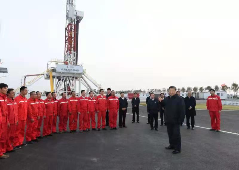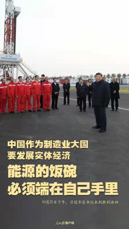 10月21日下午,習(xí)近平總書記來到勝利油田,登上鉆井平臺,察看作業(yè)情況,看望慰問石油工人。今年是勝利油田發(fā)現(xiàn)60周年。習(xí)近平代表黨中央向廣大石油職工致以誠摯問候。習(xí)近平指出,石油能源建設(shè)對我們國家意義重大,中國作為制造業(yè)大國,要發(fā)展實體經(jīng)濟,能源的飯碗必須端在自己手里。希望你們再創(chuàng)佳績、再立新功。