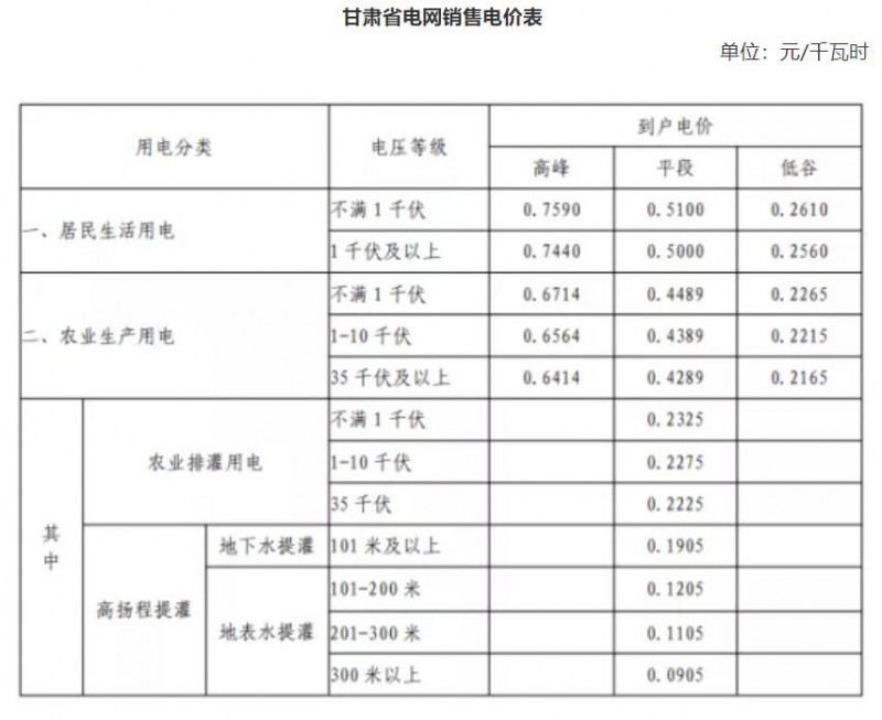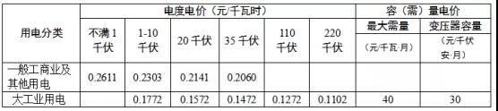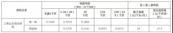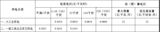 注:1.表中各電價含增值稅、線損、交叉補貼及區(qū)域電網(wǎng)容量電價,不含政府性基金及附加。2.政府性基金及附加標準分別為農網(wǎng)還貸資金2分/千瓦時、國家重大水利工程建設基金0.1125分/千瓦時、可再生能源電價附加1.9分/千瓦時、大中型水庫移民后期扶持基金0.62分/千瓦時。3.110千伏及以上“網(wǎng)對網(wǎng)”外送電省外購電用戶承擔的送出省平均輸電價格為每千瓦時不超過0.022元(含稅、含線損、下同),最高不超過每千瓦時0.03元。4.變壓器容量在315千伏安及以上的一般工商業(yè)及其他用戶可選擇執(zhí)行表中大工業(yè)生產用電兩部制電價。