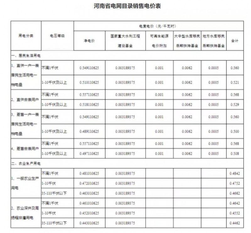 注:上表所列價格,居民生活用電和農業(yè)生產用電價格含國家重大水利工程建設基金0.1125分錢,居民生活用電價格含大中型水庫移民后期扶持基金0.12分錢。