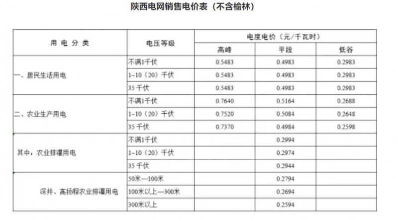 榆林電網(wǎng)銷售電價表
