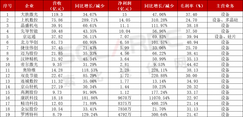 19家設(shè)備企業(yè)中,大族激光凈利潤(rùn)最高,前三季度實(shí)現(xiàn)營(yíng)收119.3億元,同比增長(zhǎng)34.67%,實(shí)現(xiàn)凈利潤(rùn)15億元,同比增長(zhǎng)47.06%。光伏方面,公司Q1-3光伏行業(yè)專(zhuān)用設(shè)備實(shí)現(xiàn)營(yíng)業(yè)收入8724.03萬(wàn),同比增長(zhǎng)42.80%,劃裂機(jī)、開(kāi)膜摻雜機(jī)等設(shè)備形成批量銷(xiāo)售。
