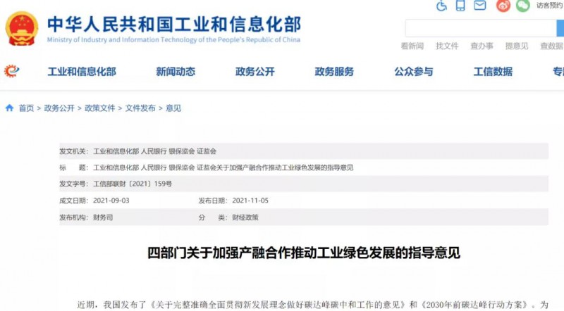 近期,我國發(fā)布了《關(guān)于完整準(zhǔn)確全面貫徹新發(fā)展理念做好碳達(dá)峰碳中和工作的意見》和《2030年前碳達(dá)峰行動(dòng)方案》。為貫徹落實(shí)習(xí)近平總書記關(guān)于金融服務(wù)實(shí)體經(jīng)濟(jì)系列重要指示精神和黨中央、國務(wù)院關(guān)于碳達(dá)峰、碳中和重大決策部署,工業(yè)和信息化部、人民銀行、銀保監(jiān)會(huì)、證監(jiān)會(huì)聯(lián)合發(fā)布《關(guān)于加強(qiáng)產(chǎn)融合作推動(dòng)工業(yè)綠色發(fā)展的指導(dǎo)意見》(工信部聯(lián)財(cái)〔2021〕159號(hào)),建立商業(yè)可持續(xù)的產(chǎn)融合作推動(dòng)工業(yè)綠色發(fā)展路徑,推動(dòng)建設(shè)工業(yè)綠色低碳轉(zhuǎn)型與工業(yè)賦能綠色發(fā)展相互促進(jìn)、深度融合的產(chǎn)業(yè)體系,以工業(yè)綠色化引領(lǐng)高端化、智能化發(fā)展,促進(jìn)工業(yè)穩(wěn)增長和有效投資,助力制造強(qiáng)國和網(wǎng)絡(luò)強(qiáng)國建設(shè),推動(dòng)經(jīng)濟(jì)社會(huì)綠色發(fā)展,為應(yīng)對(duì)全球氣候變化貢獻(xiàn)力量。