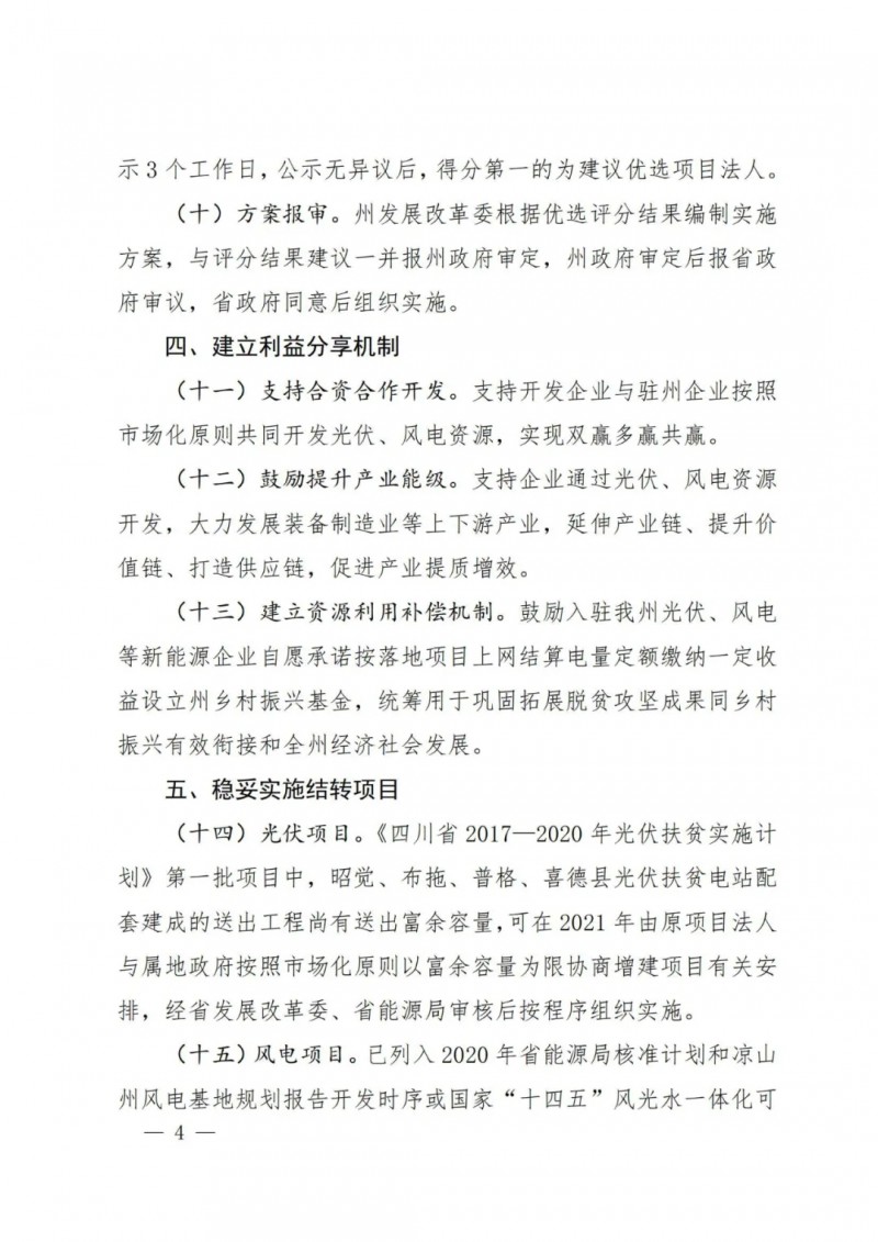 光伏項(xiàng)目?!端拇ㄊ?017—2020 年光伏扶貧實(shí)施計(jì) 劃》第一批項(xiàng)目中,昭覺、布拖、普格、喜德縣光伏扶貧電站配 套建成的送出工程尚有送出富余容量,可在2021 年由原項(xiàng)目法人 與屬地政府按照市場化原則以富余容量為限協(xié)商增建項(xiàng)目有關(guān)安 排,經(jīng)省發(fā)展改革委、省能源局審核后按程序組織實(shí)施。