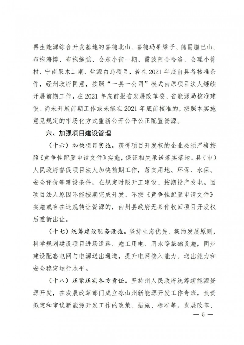 風(fēng)電項(xiàng)目。已列入2020 年省能源局核準(zhǔn)計(jì)劃和涼山州風(fēng)電基地規(guī)劃報(bào)告開發(fā)時(shí)序或國家“十四五”風(fēng)光水一體化可再生能源綜合開發(fā)基地的喜德北山、喜德瑪果梁子、德昌臘巴山、布拖海博、布拖拖覺、會(huì)東小街一期、雷波阿合哈洛、會(huì)理小箐村、寧南果木二期、鹽源白烏項(xiàng)目,若在2021 年底前具備核準(zhǔn)條 件,經(jīng)州政府同意,按照“一縣一公司”模式由原項(xiàng)目法人繼續(xù) 開展前期工作,在 2021 年底前報(bào)省發(fā)展改革委、省能源局核準(zhǔn)建 設(shè)。尚未開展前期工作或未能在2021年底前核準(zhǔn)的,按照本實(shí)施 意見規(guī)定的市場化方式重新公開公平公正配置資源。