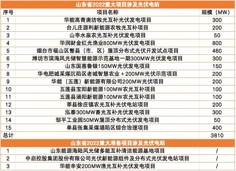 山東本次共下發(fā)449個各類重大項目清單,共涉及15個光伏項目,規(guī)模為3.81GW;并儲備了151個重大準備類項目,涉及3個光伏項目。除此外,還有部分光伏組件、以及光伏電池等生產(chǎn)項目。