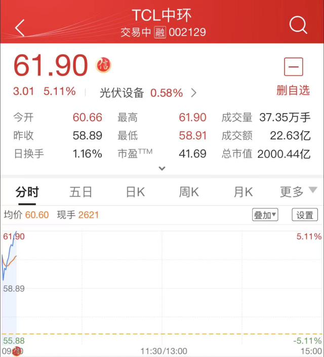 7月1日,TCL中環(huán)(SZ:002129)股價(jià)繼續(xù)延續(xù)強(qiáng)勢(shì)表現(xiàn),總市值首次突破2000億元!截至上午9時(shí)41分,公司股價(jià)大漲5.16%,總市值達(dá)到2010.63億元!自6月27日以來的五個(gè)交易日內(nèi),TCL中環(huán)股價(jià)最高漲幅高達(dá)33%!