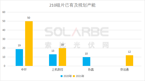 2021年中環(huán)G12硅片產(chǎn)能將從19GW提升至50GW,目前中環(huán)210產(chǎn)品規(guī)?;a(chǎn)良率已超95%,一月份中環(huán)210硅片出貨將超1.4GW,市占率高達(dá)99.5%。2020年11月4日,京運通宣布投資70 億元在樂山建設(shè)24GW單晶項目,適配210mm硅片生產(chǎn)線,一期12GW計劃于2020年第四季度開工建設(shè)。