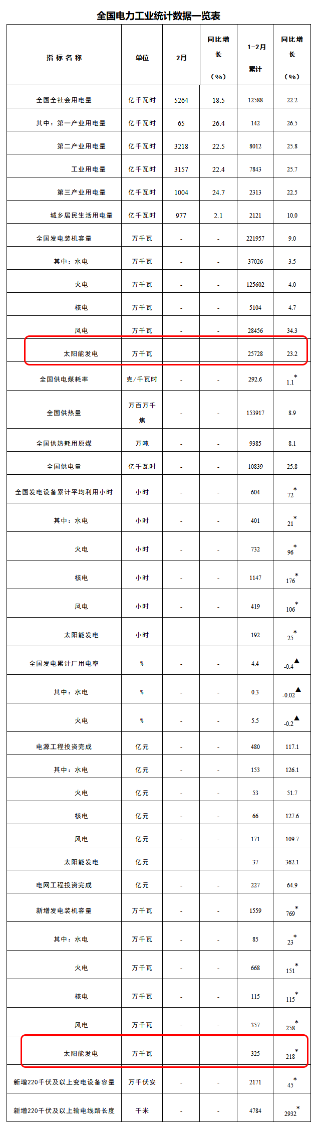 今年1-2月份,全國全社會用電量為12588億千瓦時,同比增長22.2%。全國發(fā)電裝機容量為221957萬千瓦,同比上漲9%;其中太陽能發(fā)電裝機容量25728萬千瓦,同比增長23.2%。