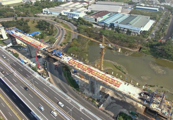 全長142.3公里的雅萬高鐵,正線80%以上設(shè)計(jì)為橋梁,其中大多數(shù)采用標(biāo)準(zhǔn)的預(yù)制箱梁連接。在跨越既有的公路、鐵路和河流等障礙的線路上,不少橋梁段采用了現(xiàn)澆工藝的連續(xù)梁施工。由水電八局承建的2號特大橋全長36公里,就有25處設(shè)計(jì)采用連續(xù)梁形式跨越立交橋、高速公路互通匝道及河流。這里的連續(xù)梁密度之高,施工難度之大,高鐵建筑史上罕見。因此,連續(xù)梁施工成為水電八局管段內(nèi)最重要的施工內(nèi)容之一。