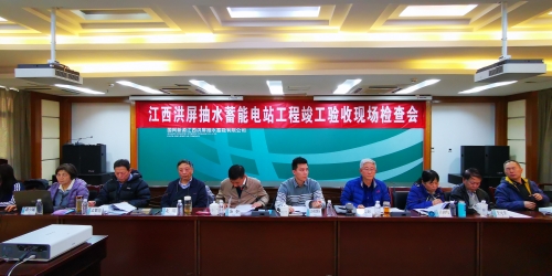 驗收委員會會議于2019年12月6日在南昌召開。會議由王忠耀副院長主持。會議首先由主任委員王忠耀介紹了竣工驗收的依據、程序和驗收委員會成員,隨后,工程運行管理單位洪屏公司李幼勝董事長致詞,會議先后聽取了洪屏抽水蓄能有限公司關于工程建設、電站運行管理及竣工驗收專項驗收情況的匯報,設計院關于工程設計情況的匯報,以及驗收專家組關于驗收結論意見的介紹。與會各位委員、代表就工程竣工驗收條件和存在的問題進行了研究和討論。驗收委員會同意江西洪屏抽水蓄能電站通過工程竣工驗收。